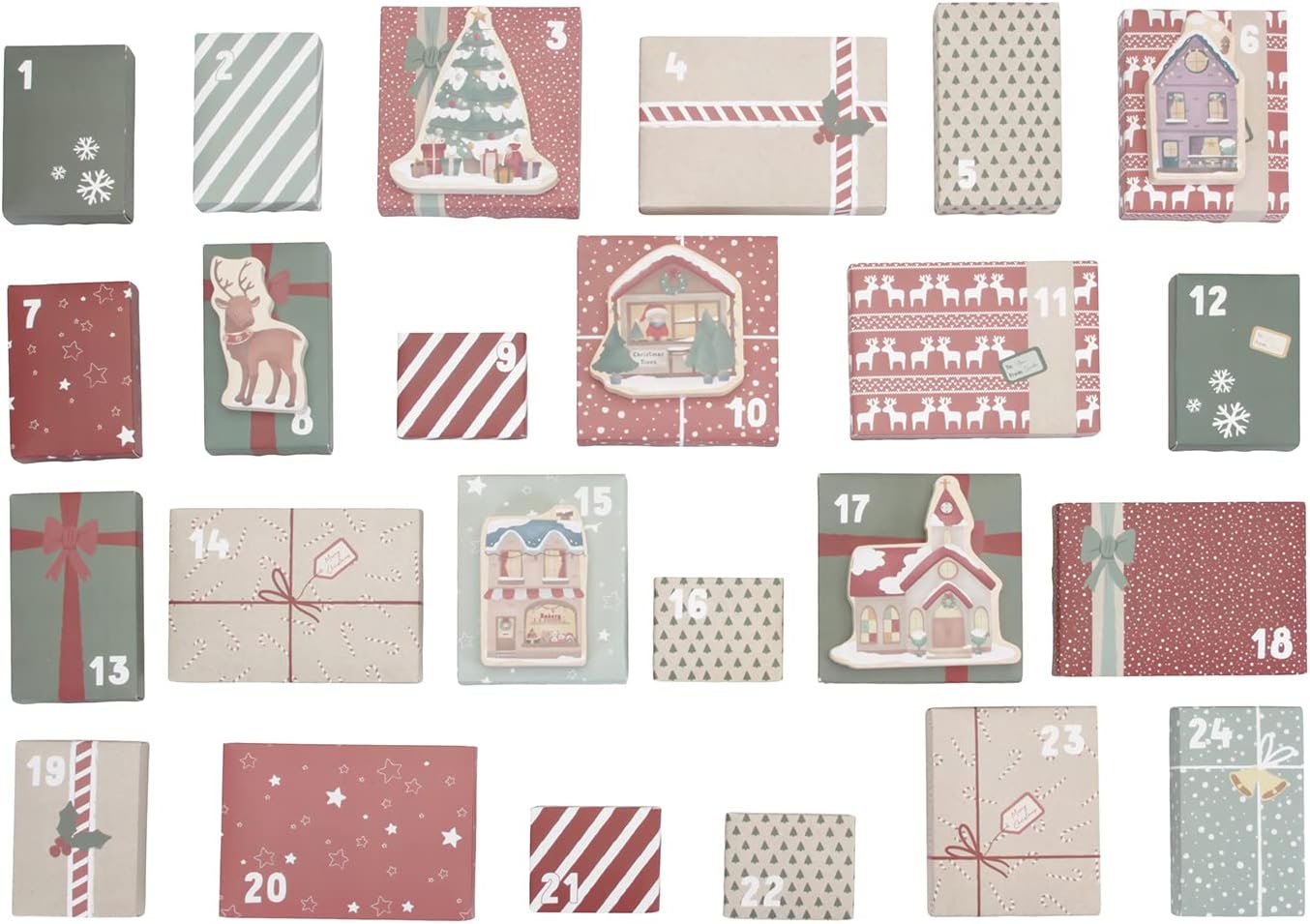 Contiene 24 regalos con 25 figuras de madera.