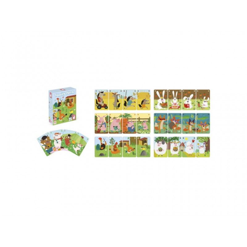 ¡Diviértete realizando el máximo número de familias posible! Las familias de animales son las siguientes: carneros, conejos, vacas, caballos, cerdos, zorros, gallinas. Cada familia se compone de 4 personajes: el padre, la madre, el hijo y la hija.