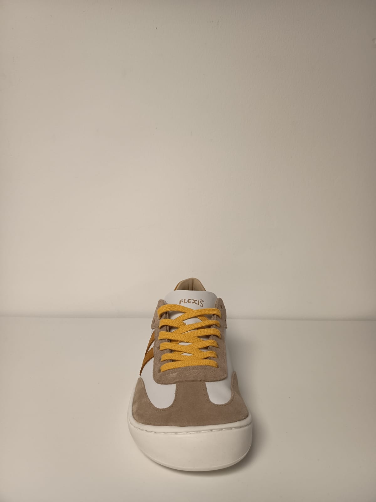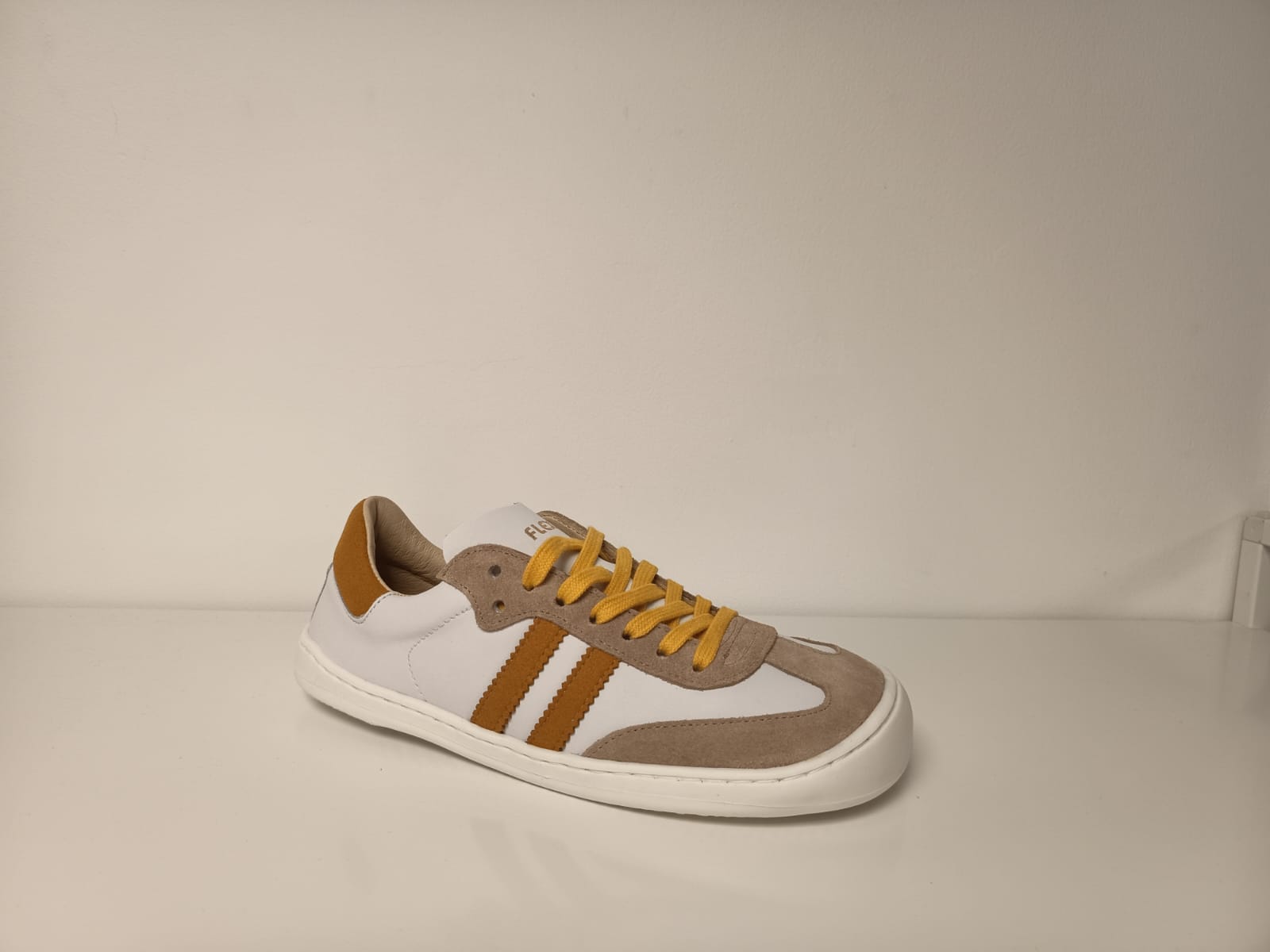 FLEXINENS 9026-R ARENA/BLANCO/MOSTAZA. Deportiva respetuosa (calzado barefood) para adultos FlexiNens fabricadas en piel.