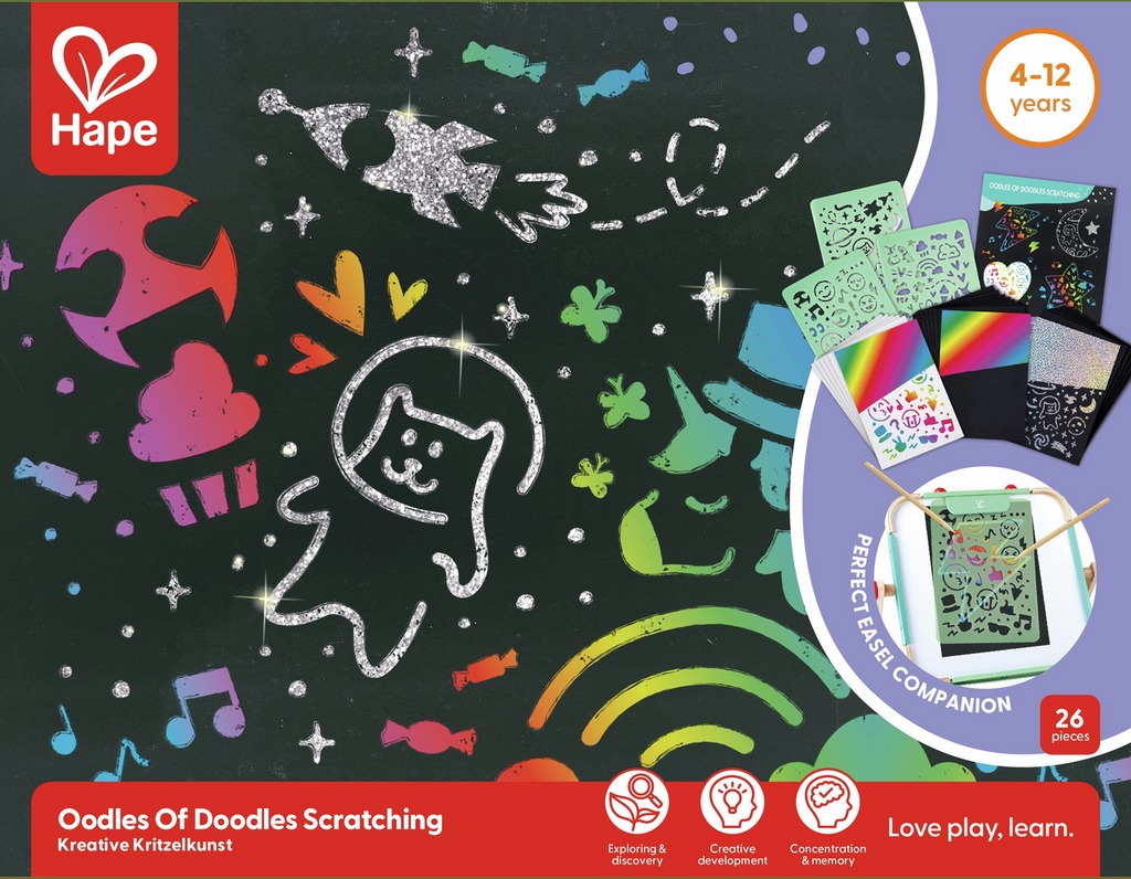 Lleva los garabatos a un nivel completamente nuevo con este increíble juego de rayado. Coloca las plantillas sobre las hojas incluidas y rasca con un lápiz de madera para descubrir las diferentes capas de color que hay debajo. Incluye un póster con consejos y sugerencias. Perfecto para usar en el caballete de sobremesa Hape.